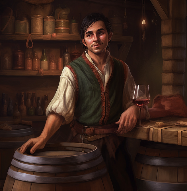 Walbern is a male half-elf from Tattinmor originally. He came to the Sundersky Mountain region, years ago now, seeking a famed forest of wild grapes. He is a vintner who works for Angrum Ironchin and also tends bar at The Honey Goblet Tavern in Harlingwell. Rumors say he was once a famous winemaker in the halls of the Halfling King – Orlang Longsky. Walbern is generally joyous and extroverted, calling everyone and their dog ‘Friend!’.